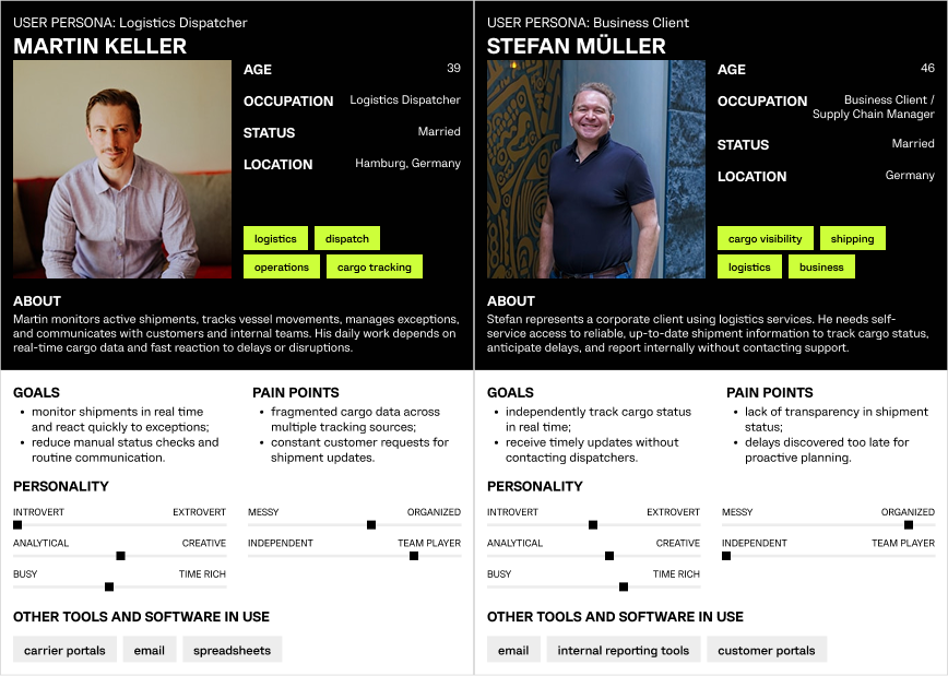 Designed the platform around real operational roles, focusing on logistics dispatchers responsible for monitoring shipments and managing exceptions, and business clients who required self-service access to real-time cargo visibility and documentation.