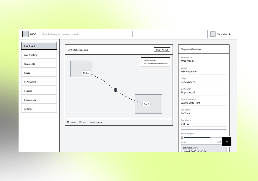 Our client required a unified platform to gain real-time cargo visibility, reduce dispatcher workload, and enhance customer communication. We built a system that consolidates AIS/GPS data, automates shipment status updates, and adds AI-driven support for both dispatchers and customers—the result: fewer support requests, more stable SLAs, and higher customer satisfaction.