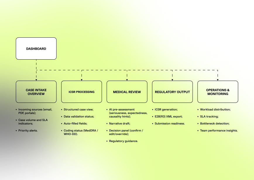 The platform design focused on reducing manual effort in high-volume pharmacovigilance workflows while maintaining full control and traceability for regulated processes. The goal was to streamline case handling and support faster, more consistent medical review without removing human oversight.