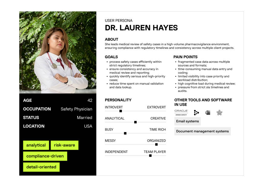 The product design was guided by semi-fictional personas representing pharmacovigilance professionals to ensure efficient workflows, regulatory compliance, and user-centric medical review processes.