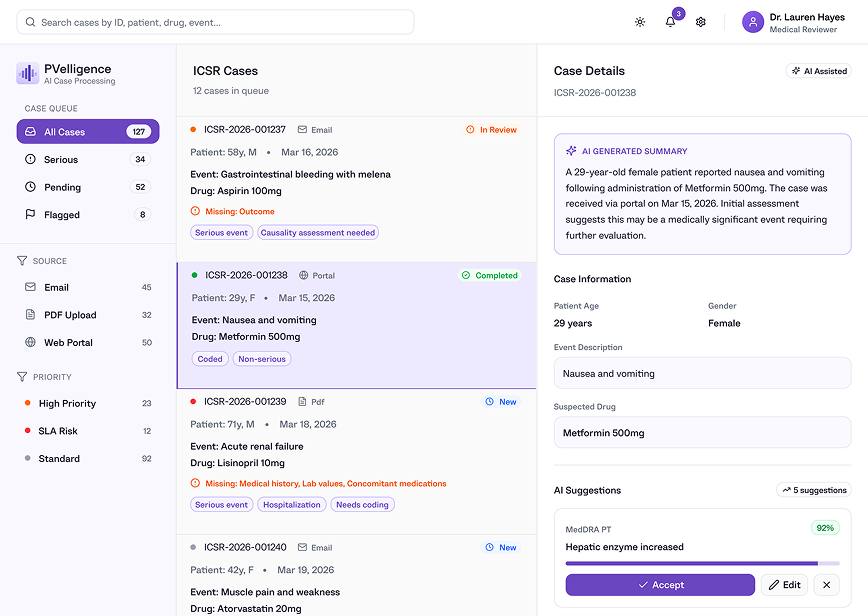 The second layer supports physicians and PV specialists during review. AI-generated pre-assessments surface seriousness, expectedness, causality cues, and reporting suggestions, while the final medical and regulatory decisions remain fully human-controlled. This combination reduced repetitive operational work while improving review consistency and decision speed.