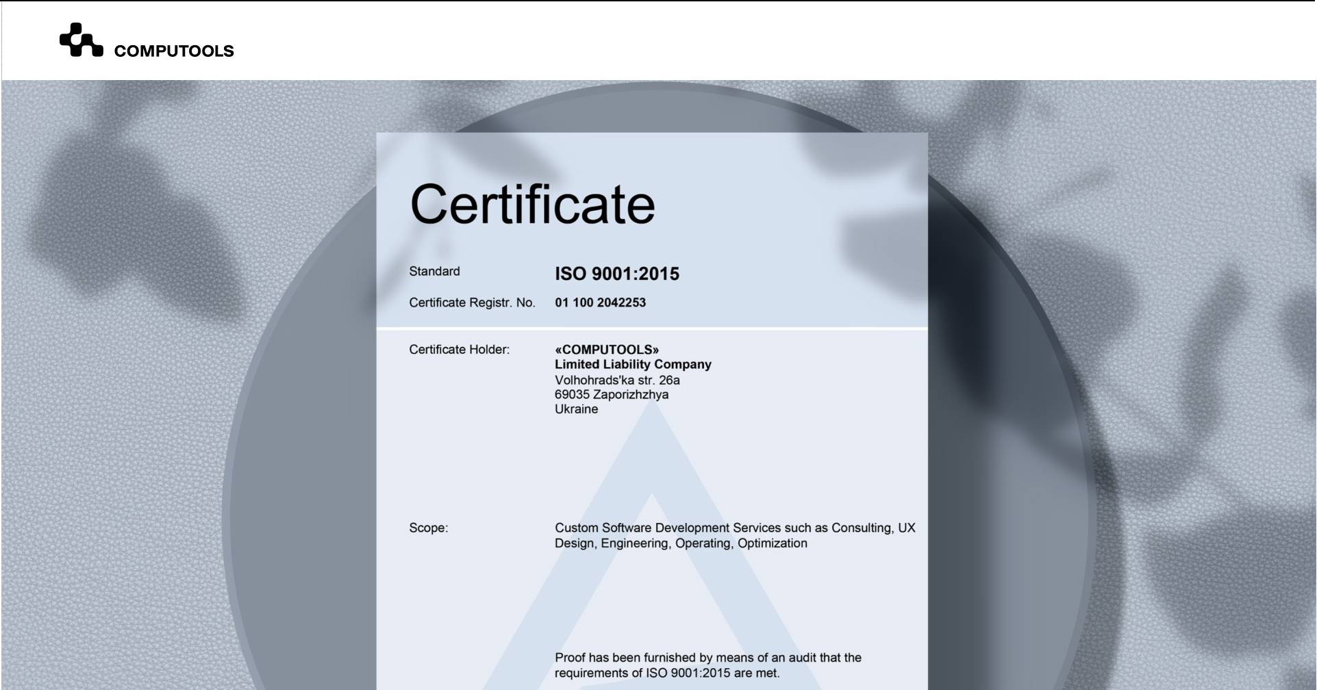 The ISO 9001:2015 certificate assures the company’s credibility and confirms that Computools develops structured and solid software solutions that meet customer requirements and expectations.