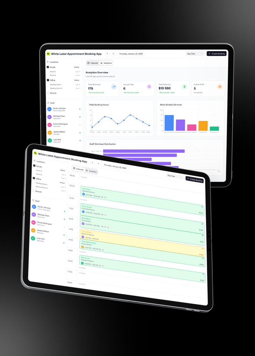 A white-label appointment booking app is a ready-made scheduling solution you can launch under your own brand. It includes customer booking and an admin system for managing services, staff, and appointments.